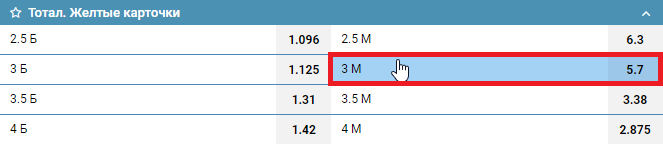 В росписи на этот же матч букмекер предлагает пари «тотал желтых карточек меньше 3.0». Это маловероятный результат, поэтому БК предлагает крупный коэффициент на такое событие — 5.7. Поставив 100 рублей, в случае удачи можно получить 470 рублей чистого выигрыша.