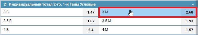 Также букмекер предлагает сделать ставку на количество поданных угловых. Маркет «индивидуальный тотал угловых второй команды в первом тайме меньше 3.0» привлекает крупным коэффициентом — 2.68. Если вторая команда в линии («Бавария») подаст в первом тайме меньше 3 угловых, размер чистого выигрыша составит 168 рублей на каждые 100 рублей ставки. Если немецкая команда исполнит ровно три стандарта с угла поля, букмекер вернет деньги на счет.