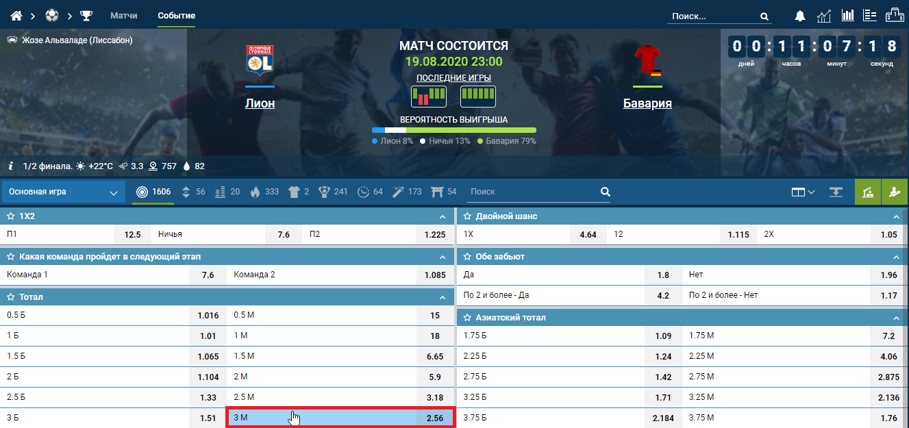 Когда речь идет о голах, букмекеры предлагают неплохие коэффициенты на тотал меньше 3. Для примера возьмем матч Лиги чемпионов между «Лионом» и «Баварией». Ставка ТМ(3.0) выиграет, если в основное время матча будет забито два или меньше голов.