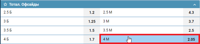 В росписи есть и еще один вариант — «тотал офсайдов меньше 4.0» за игру. Расчет аналогичен: ставка сыграет, если за весь матч положение «вне игры» будет зафиксировано 3 раза или меньше. Коэффициент на такое событие — 2.05. В случае успеха можно заработать 105 рублей чистого выигрыша на каждые 100 рублей ставки.