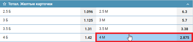 Также можно поставить на тотал желтых карточек меньше 4.0 по итогам игры. Коэффициент на такое событие в матче «Лион» — «Бавария» — 2.875. При ставке в 100 рублей можно получить 187 рублей чистого выигрыша, если в матче будут показаны 3 желтые карточки футболистам обеих команд. Если в протоколе матча будет зафиксировано ровно 4 желтые карточки, БК вернет поставленную сумму.