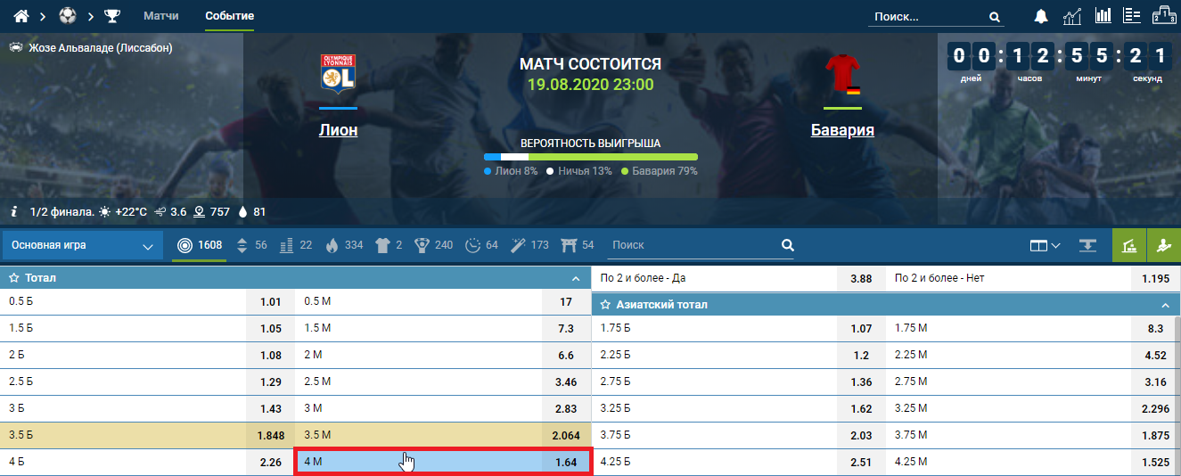 Для примера возьмем матч Лиги чемпионов между «Лионом» и «Баварией». Ставка ТМ(4.0) выиграет, если в матче будет забито три или меньше голов.