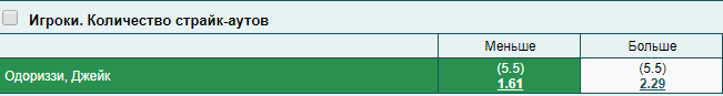 Пари сделано на то, что питчер «Миннесоты» Джейк Одориззи не заработает больше пяти страйк-аутов. Шесть и больше — проигрыш.