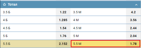 5.5 — значение тотала, по которому букмекер будет проверять, сыграла ставка или нет.
