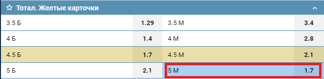 Разберем ставку 5 М в матче между командами «РБ Лейпциг» — ПСЖ на желтые карточки. Чтобы ставка прошла, судья должен показать не больше четырех желтых карточек к окончанию основного времени. Если в матче будет показано пять ЖК, сумма ставки вернется на счет, если шесть — ставка сгорит.