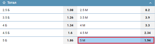 В данном примере ставка на тотал 5 М в матче (без учета дополнительного времени).