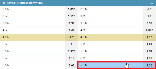 Еще один вариант для ставки — «тотал желтых карточек меньше 6.5». Это много для европейского футбола, и потому коэффициент скромный — 1.26. Если в матче будет 6 или меньше предупреждений с обеих сторон, пари принесет 26 рублей чистого выигрыша на каждые 100 рублей ставки.