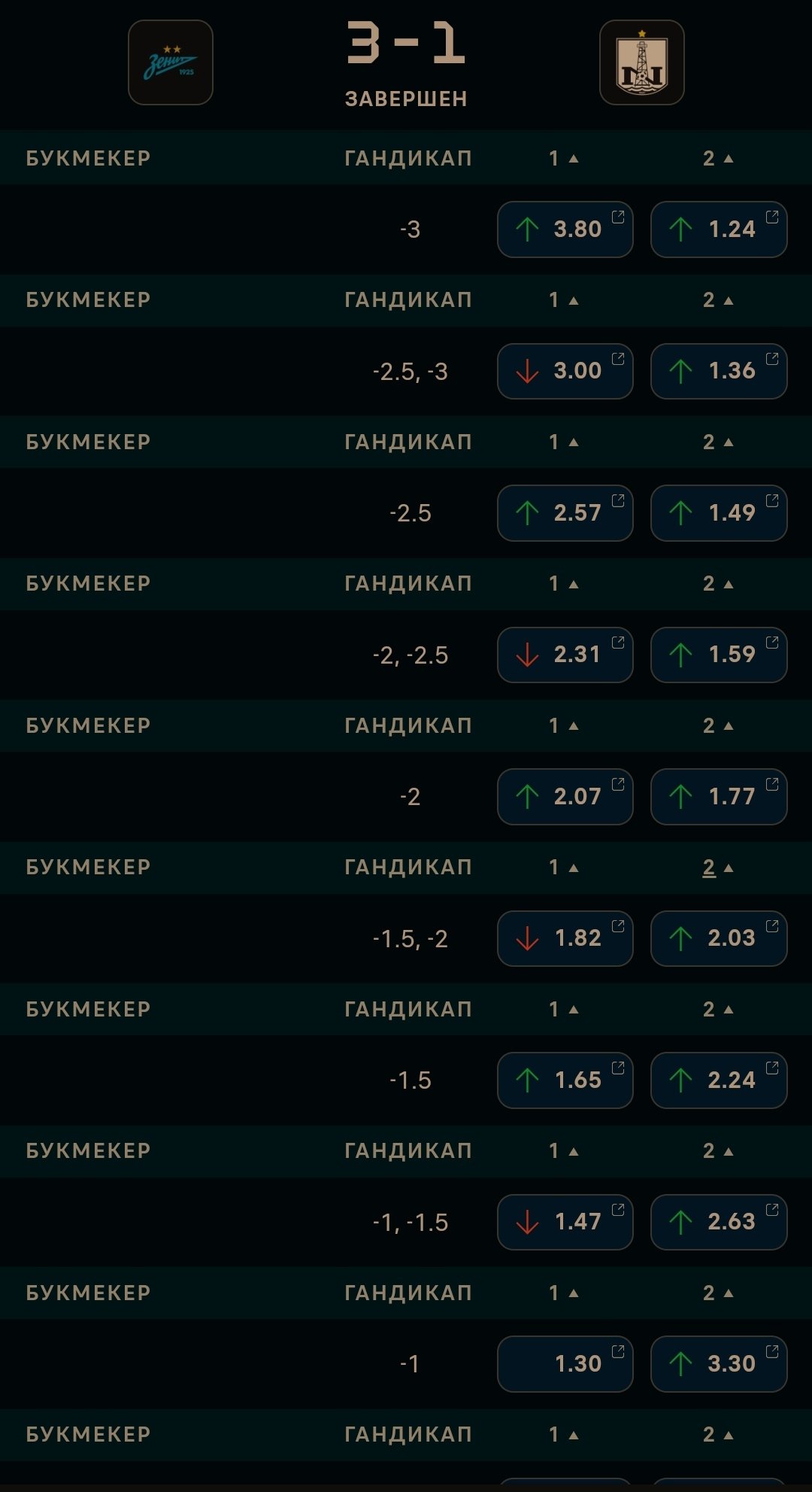 Рассмотрим в качестве примера матч Кубка PARI Премьер-2023 между «Зенитом» и «Нефтчи», который закончился со счётом 3:1. Питерский клуб затащил стандартную фору (−1,5), по (−2) можно было получить возврат, ставки на более высокие гандикапы были рассчитаны поражением.