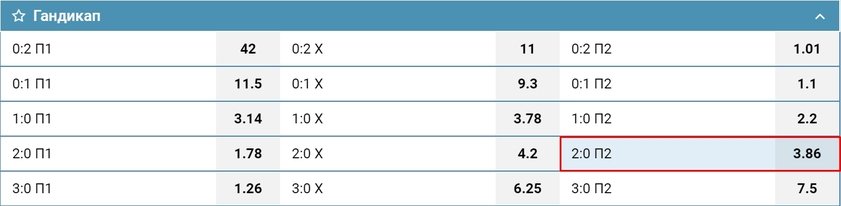 Европейский гандикап 2:0 означает, что «Саутгемптон» начнет с преимуществом в 2 гола. Далее букмекерская контора предлагает 3 варианта выбора ставки: П1 (победа хозяев), Х (ничья) и П2 (победа гостей). Соответственно, европейский гандикап 0:1 предполагает абсолютно то же самое, только с заведомым преимуществом уже для гостей в один гол.