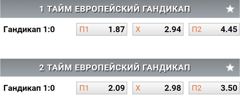 Помимо ставок на европейский гандикап в основное время у некоторых отечественных легальных букмекеров существуют варианты подобных ставок в каждом из таймов.