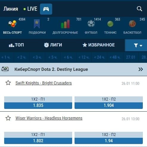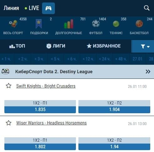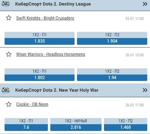 Каждый день букмекерская контора «1хСтавка» предлагала игрокам более 200 событий из мира киберспорта. БК уделяла внимание не только популярным турнирам и матчам, но и менее попсовым соревнованиям. Так, например, в линии «1хСтавки» были такие турниры по Dota 2, ставки на которые тогда принимали далеко не все букмекерские конторы: Ultras Dota Pro, Bitsler Cup и Destiny League.