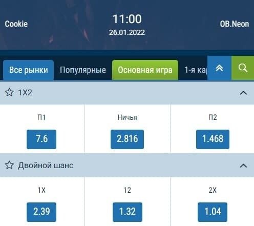 Чтобы поставить на киберспорт в букмекерской конторе «1хСтавка», требовалось на главной странице выбрать раздел «Кибер». Сразу открывались четыре вкладки:
