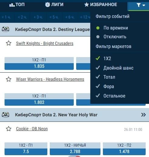 Фильтр. В «Фильтре» клиенты БК «1хСтавка» могли отсортировать киберспортивные события по времени их начала, а также по выбранным маркетам.