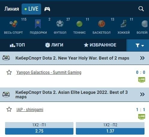 Лиги. Вкладка «Лиги» показывала игрокам в алфавитном порядке список всех киберспортивных дисциплин, на которые принимала ставки БК.
