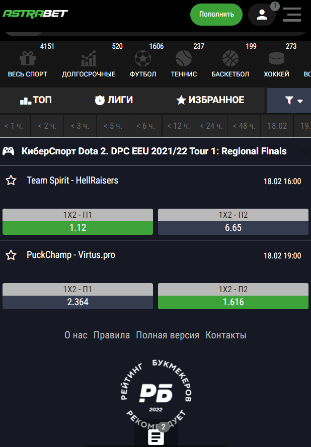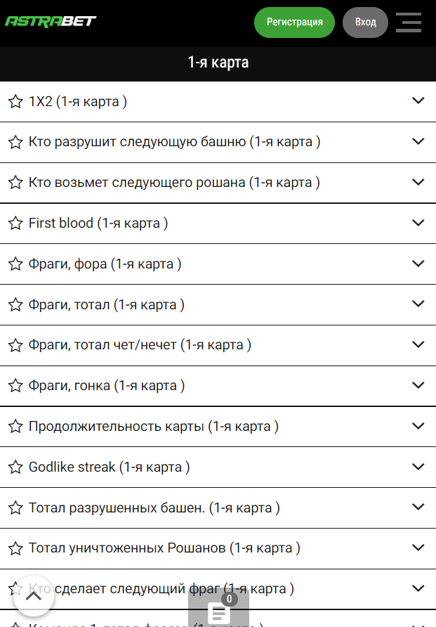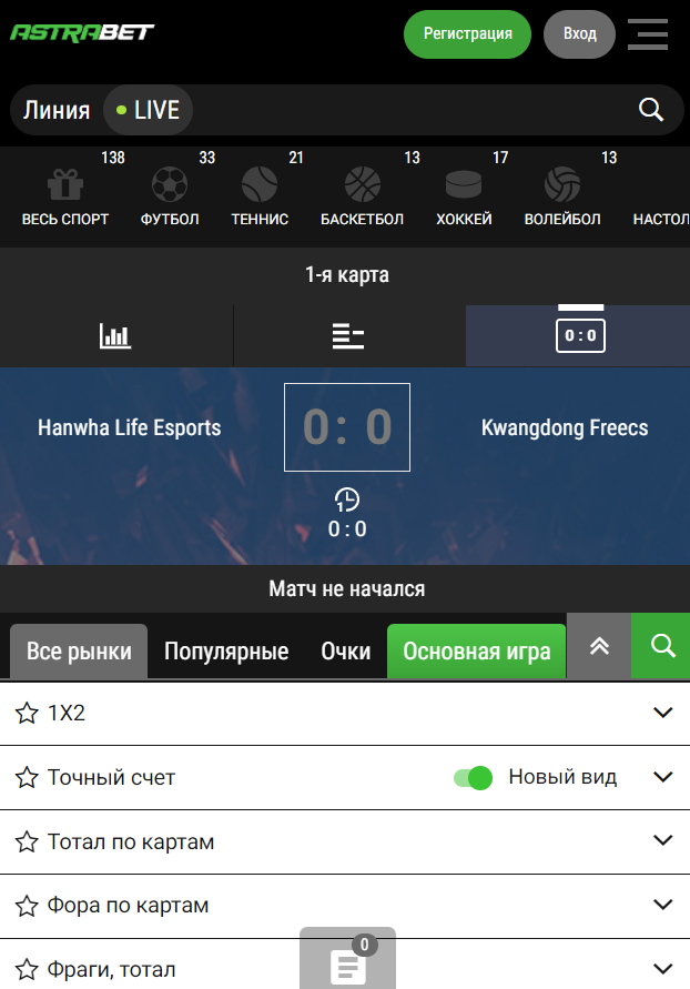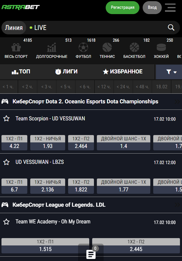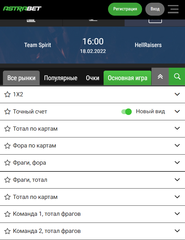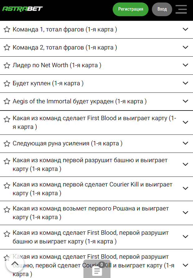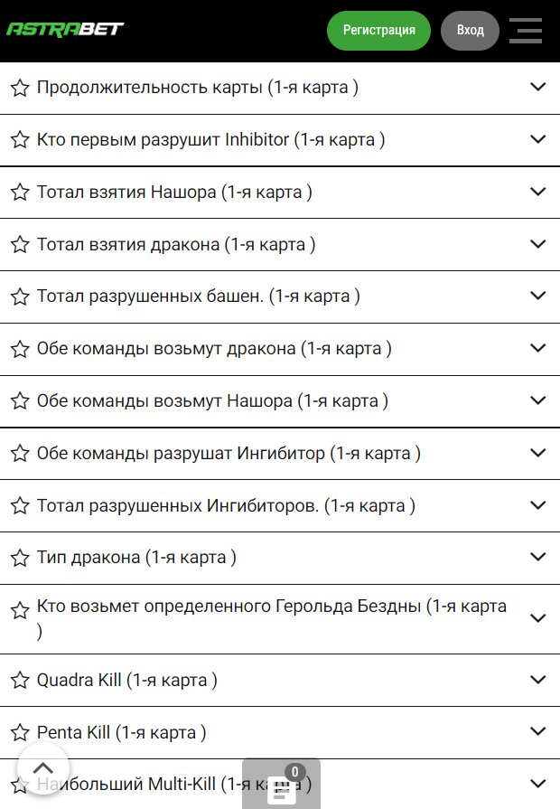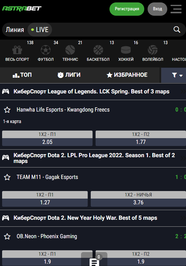 Возможность делать ставки на лайв-события у БК Astrabet есть и в киберспорте. Маржа не отличается от прематча — 4-9%. Роспись от прематча может отличаться как в большую, так и в меньшую сторону.