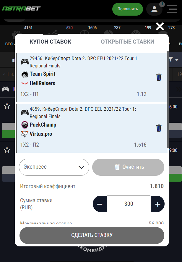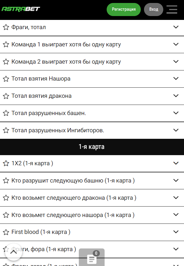 Маржа на киберспорт у БК Astrabet имеет серьёзный разброс — 4-9%. По росписи всё тоже довольно скромно.
