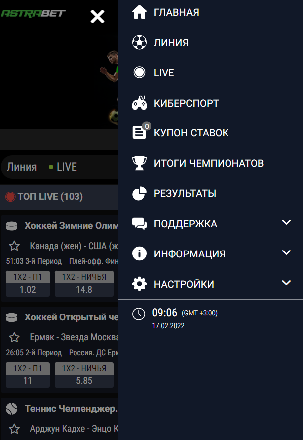 Ещё одна крупная дисциплина у БК Astrabet, по которой доступны различные маркеты.