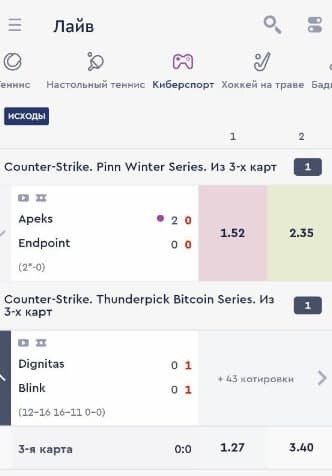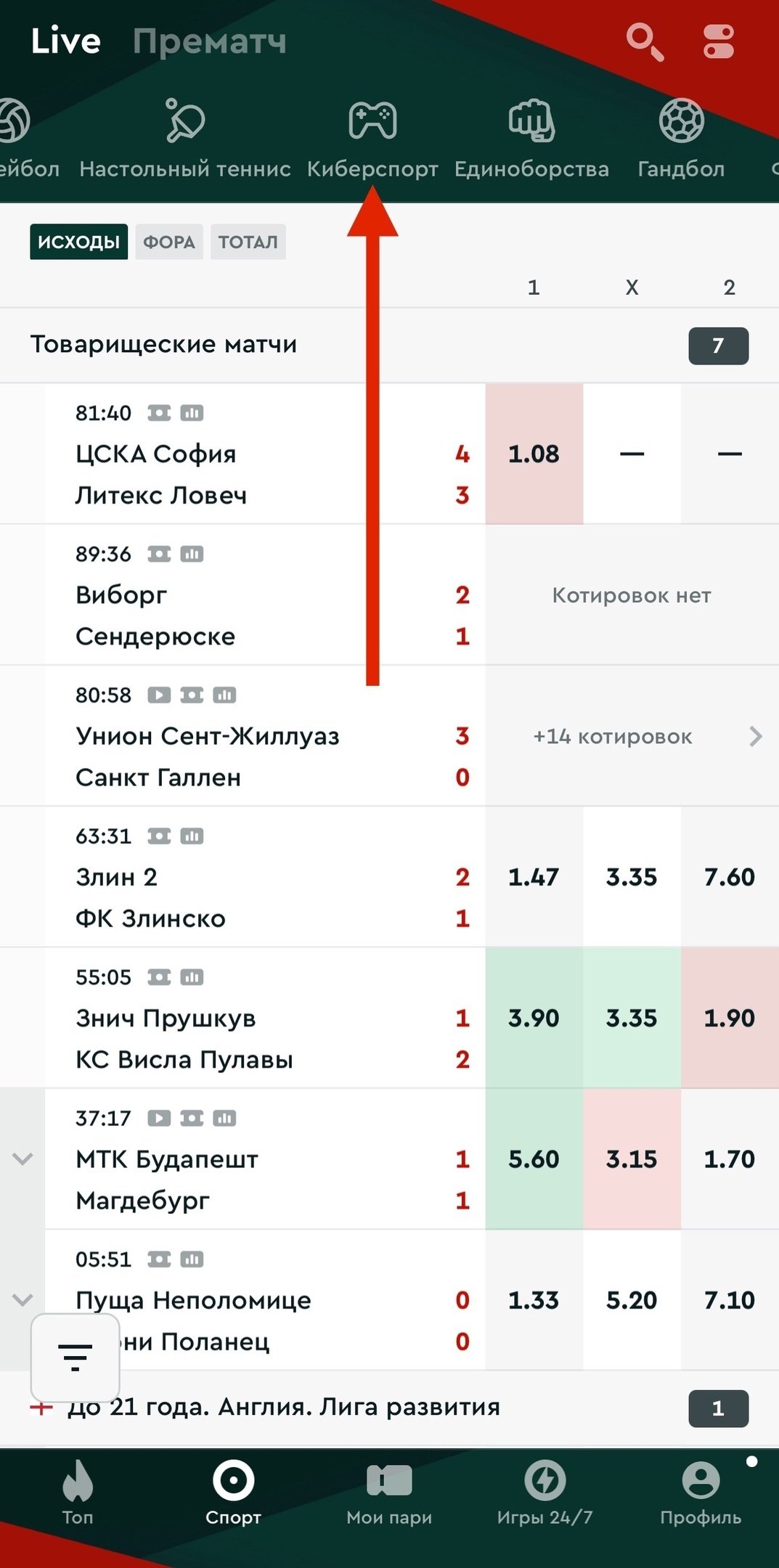 2. В списке видов спорта по горизонтали вы найдёте иконку с изображением геймпада — это раздел «Киберспорт».