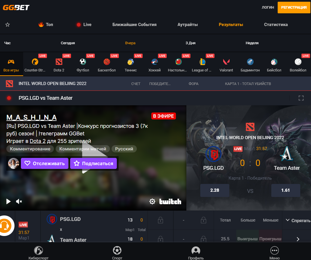 На ggbet.ru была возможность просмотра видеотрансляции матчей (кнопка «Смотреть» рядом с названиями команд). Прямой эфир открывался в центре экрана через сервис Twitch, где при необходимости можно отрегулировать уровень звука, качество изображения или открыть трансляцию в отдельном окне. Аналогично это работало и в приложении.