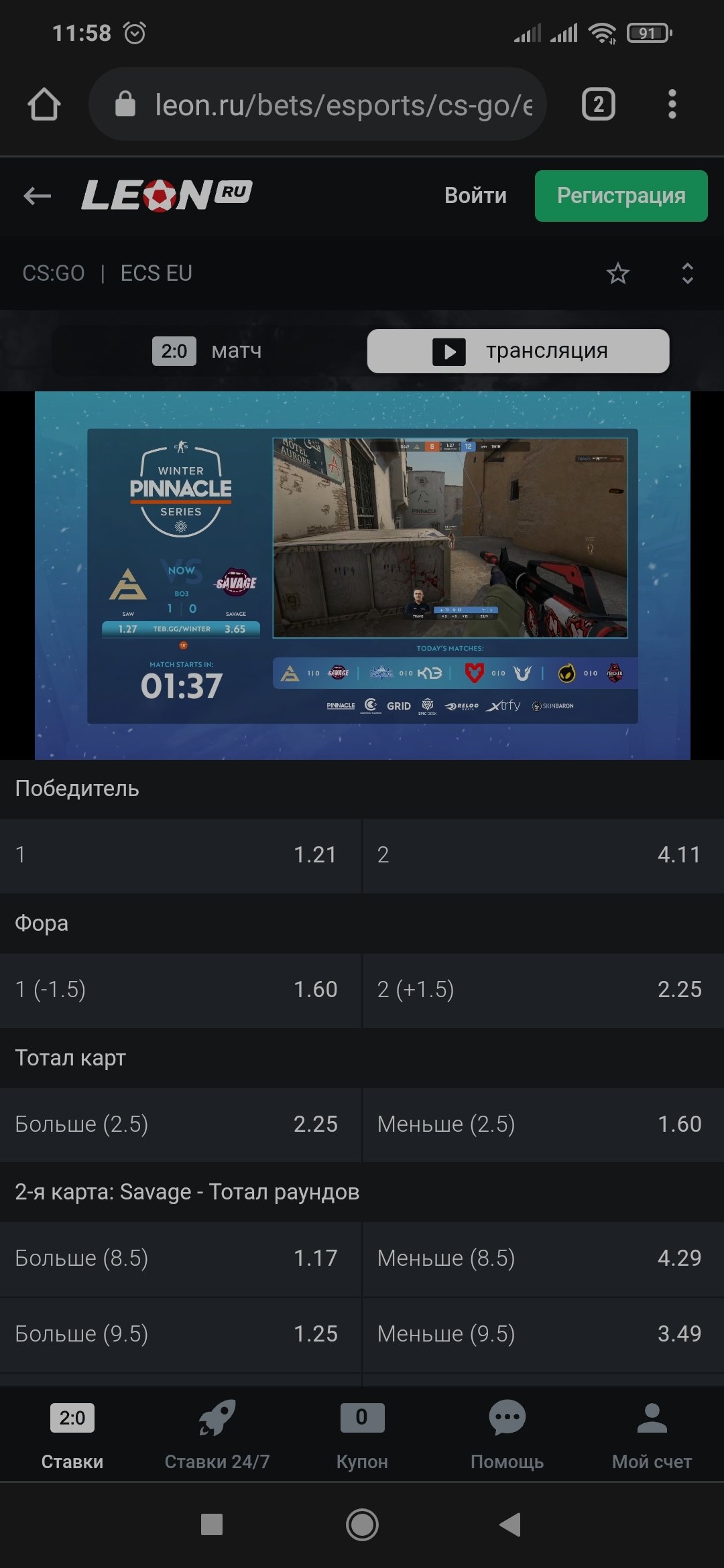 В разделе «Киберспорт» найдите нужный матч, а исходы выберите тапом на коэффициент. Когда закончите просмотр, переходите в «Купон»Кнопка на нижней панели. , вводите сумму пари и подтверждайте его.