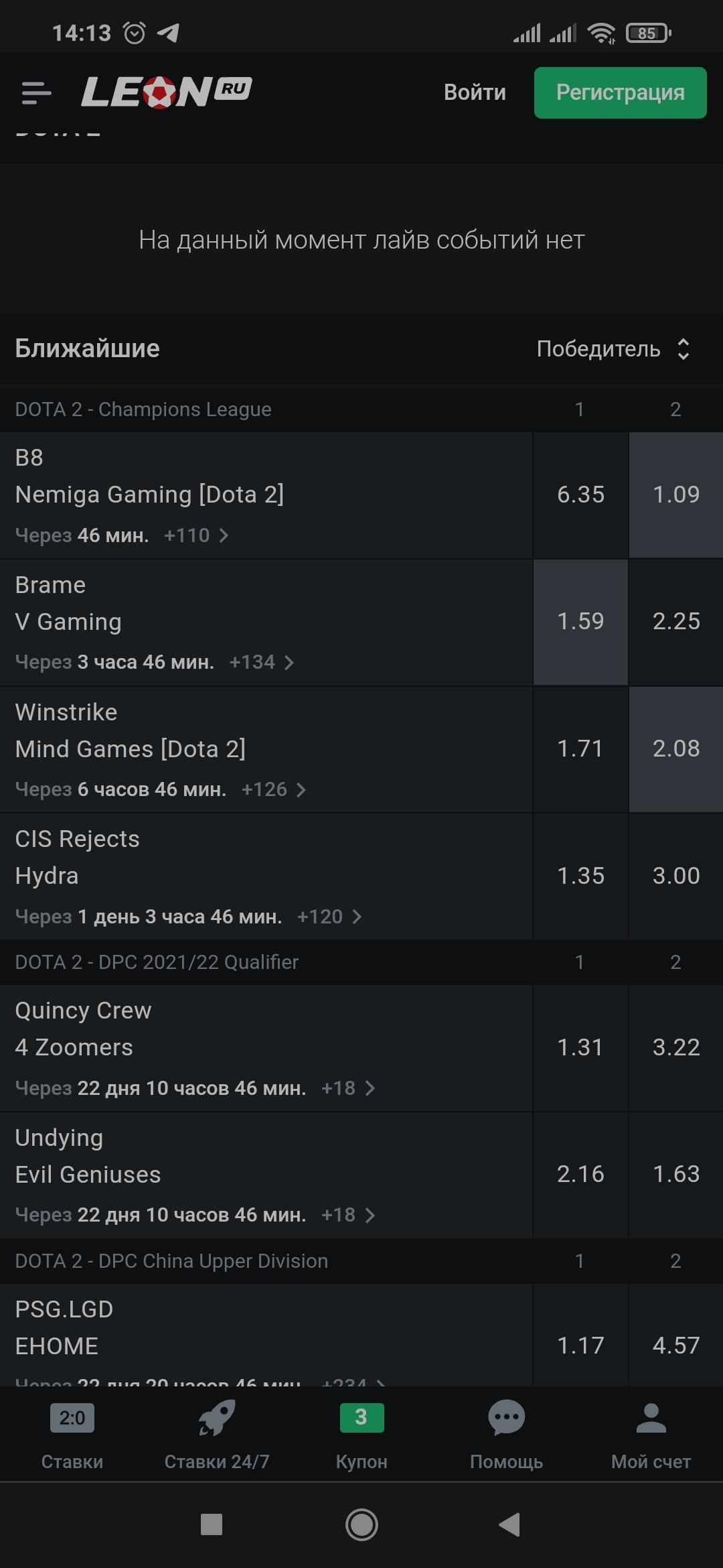 В БК «Леон» для ставок найдутся топовые киберспортивные дисциплины — Dota 2, CS:GO и LoL, где представлены турниры разного уровня, от матчей в DPC лиге Турниры, по результатам которых отбираются команды на главный турнир года. до Pinnacle Cup Региональный турнир стороннего организатора на 10 команд. . Не обделены вниманием и менее популярные игры — Rocket League, Halo, Starcraft 2 и другие.