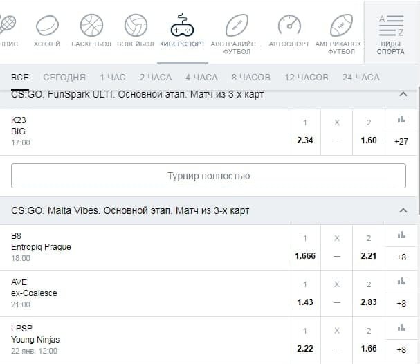 Линию на киберспортивные события в мобильном приложении БК «Марафон» можно найти в горизонтальном меню в верхней части сайта компании. Нажимаем кнопку «Спорт» и переходим к выбору видов спорта для ставок. Иконку с джойстиком, которая представляет киберспорт, несложно найти в списке. Нажав на неё, вы откроете список предстоящих событий, который можно фильтровать в зависимости от времени их начала (от матчей в пределах ближайшего часа до ставок в ближайшие сутки).