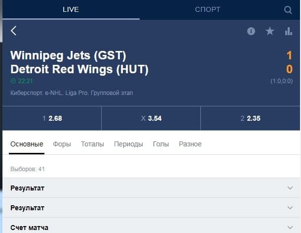 В live-ставках букмекер предлагает игрокам более широкий выбор рынков: точный счёт матча, разница в счёте, стиль победы, голы+результат матча, очерёдность забиваемых голов в матче.