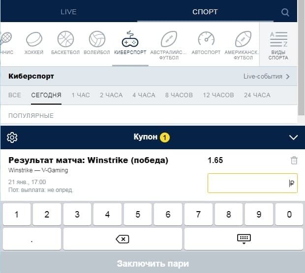 Линию на киберспортивные события в мобильном приложении БК «Марафон» можно найти в горизонтальном меню в верхней части сайта компании. Нажимаем кнопку «Спорт» и переходим к выбору видов спорта для ставок. Иконку с джойстиком, которая представляет киберспорт, несложно найти в списке. Нажав на неё, вы откроете список предстоящих событий, который можно фильтровать в зависимости от времени их начала (от матчей в пределах ближайшего часа до ставок в ближайшие сутки).