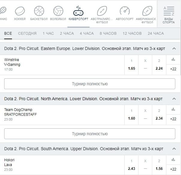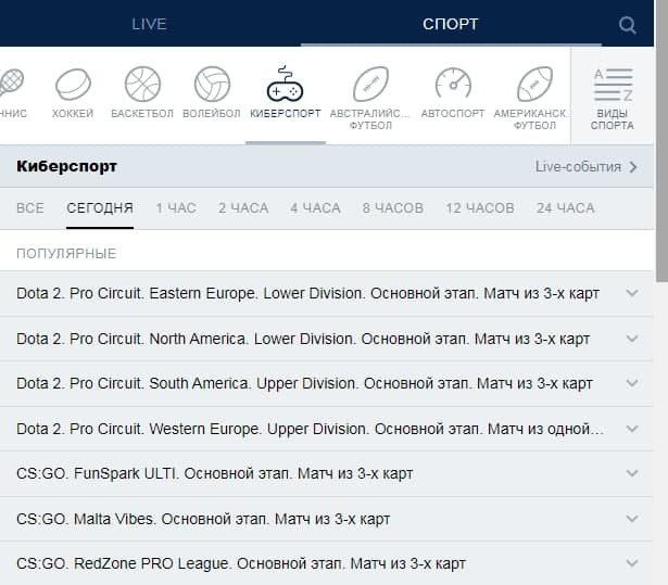 Мало киберспортивных дисциплин в прематче и режиме Live (5-6).