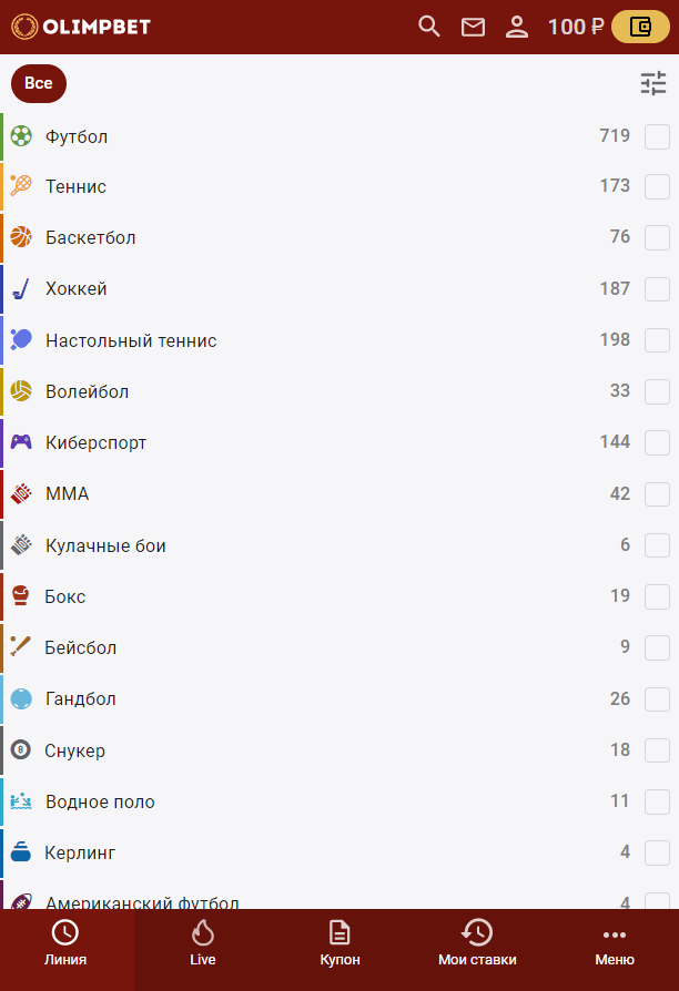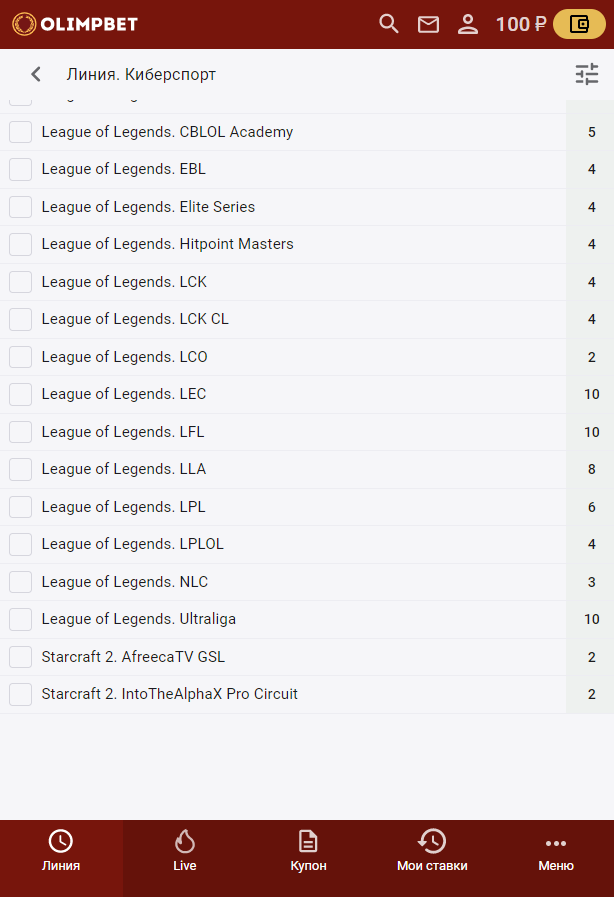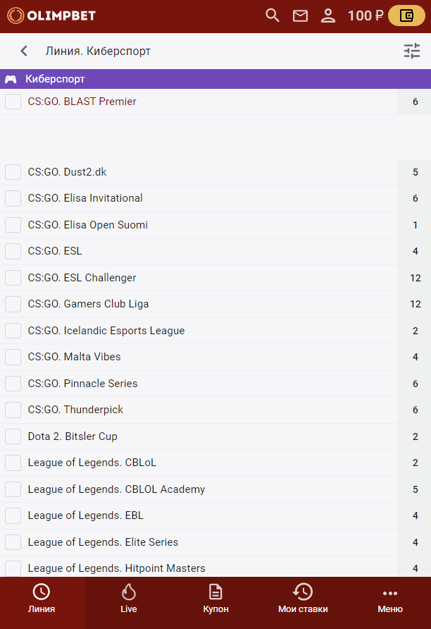 На сайте БК «Олимп» вкладку «Киберспорт» можно найти среди других в меню «Линия». Отдельные вкладки предусмотрены для симуляторов: киберфутбола, кибербаскетбола и киберхоккея.
