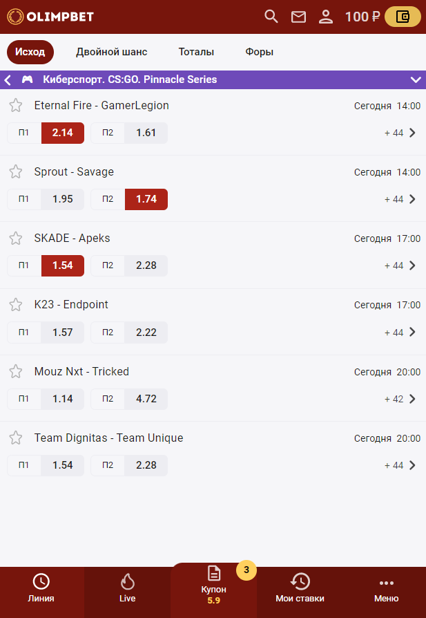 Для того чтобы ставить на киберспорт на сайте букмекерской компании «Олимп», нужно пройти регистрацию и верификацию личности в ЦУПИС. После авторизации и внесения депозита выбираем интересующую дисциплину и матч, после чего нажимаем на коэффициент нужного исхода игры. Откроется купон, где вы можете ввести сумму и сделать ставку. Или же можете продолжить просмотр различных пари, а когда закончите, нажать кнопку «Купон» и завершить оформление ставки.