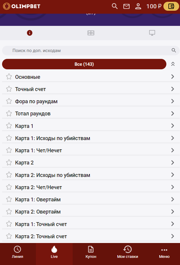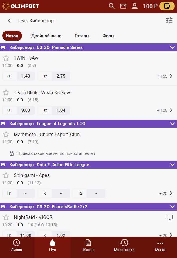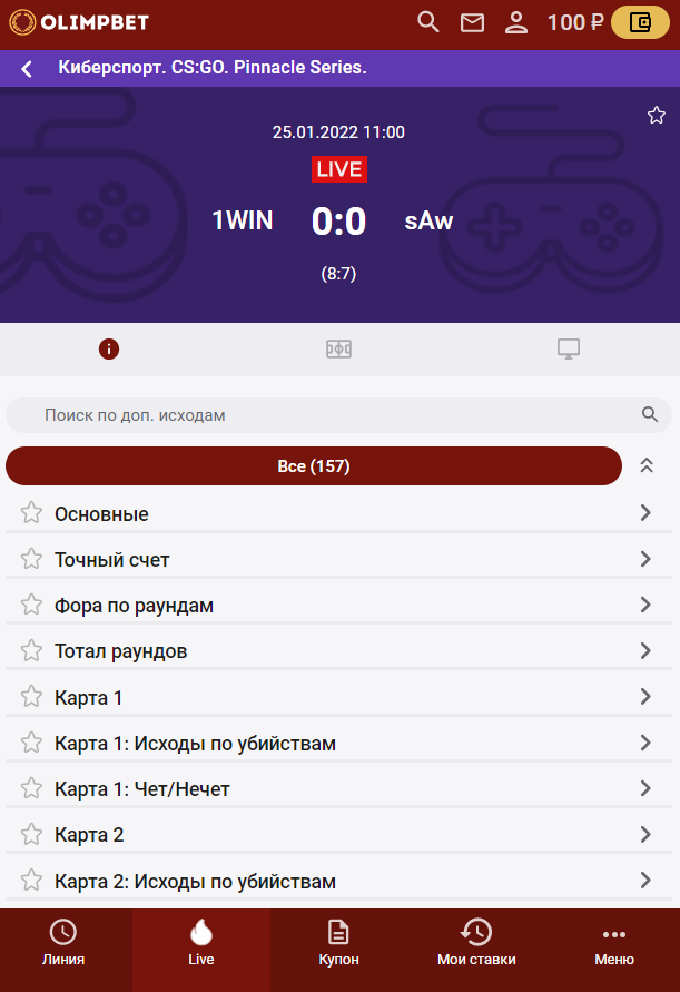 Нажав на кнопку Live на нижней панели, вы откроете список видов спорта, по которым матчи идут прямо сейчас. В том числе по киберспорту. Роспись в таких играх не уступает прематчу, а иногда могут появиться и дополнительные маркеты (в основном на Dota 2, CS:GO и LoL). Просмотр трансляции у БК для киберспортивных дисциплин не предусмотрен.