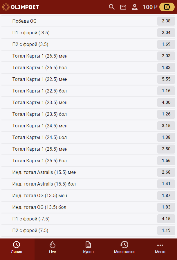 БК «Олимп» уступает большинству конкурентов также и по росписи, и по уровню маржи — около 8-9%. Больше всего ставок на CS:GO, Dota 2 и киберфутбол/хоккей/баскетбол. Однако и здесь лишь джентльменский набор: П1П2, фора и исход.
