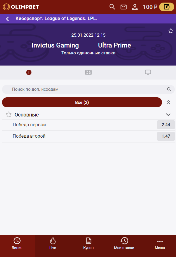 По LoL, как и по остальным дисциплинам, есть лишь ставки на победителя.