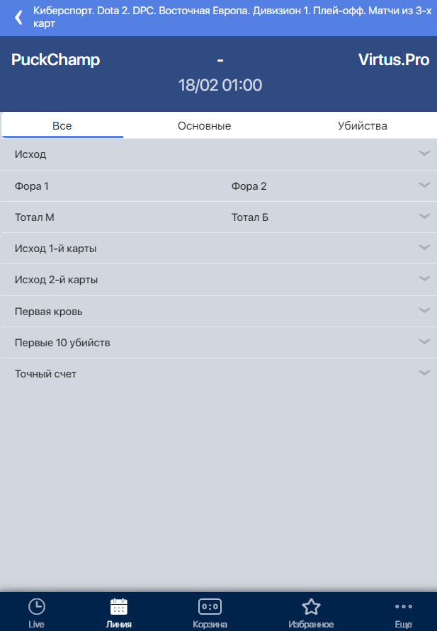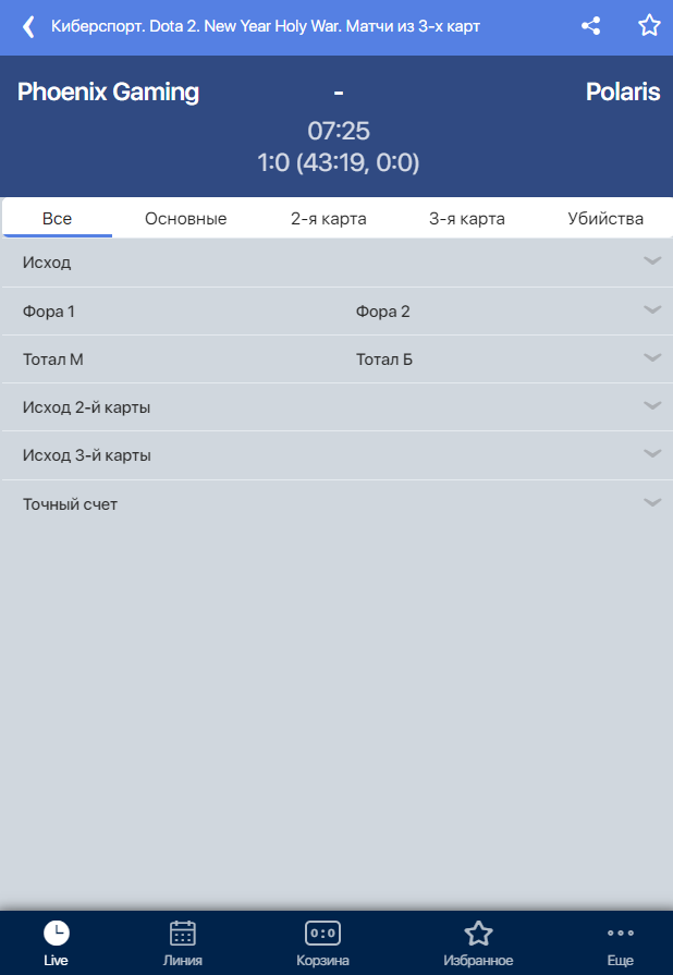 Роспись у букмекера очень скромная по сравнению с другими БК для ставок на киберспорт. На матчи по Dota 2 и CS:GO предлагается максимум 40 рынков: П1П2, тотал, фора и пара дополнительных маркетов. И то только на крупных соревнованиях. По LoL, Valorant, StarCraft, StarCraft II и FIFA редко можно увидеть что-то больше чем ставка на победителя.