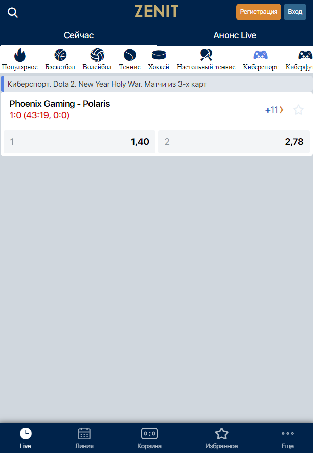Клиенты БК «Зенит» могут делать ставки на киберспорт в режиме live. Для перехода к ним нужно на нижней панели тапнуть по кнопке Live и там среди других видов спорта выбрать «Киберспорт»(или «Киберфутбол» для ставок на FIFA). Маржа в таких событиях чуть выше, чем в прематче: 7-9%.