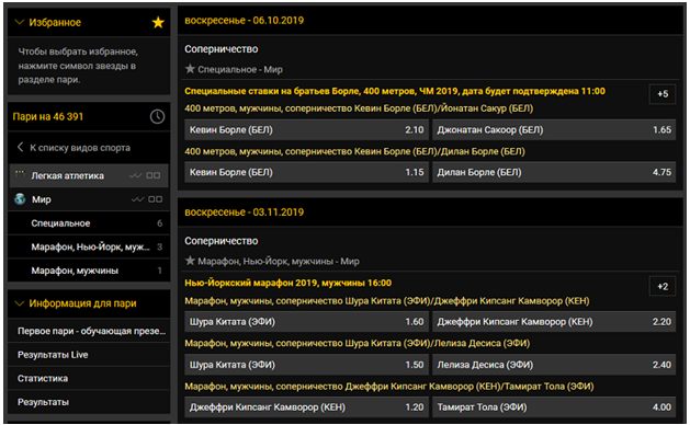 На крупных легкоатлетических стартах букмекер расширяет линию. К примеру, во время проведения Олимпийских игр можно найти рынок на количество медалей определённой страны или поставить на то, будет ли установлен новый рекорд.
