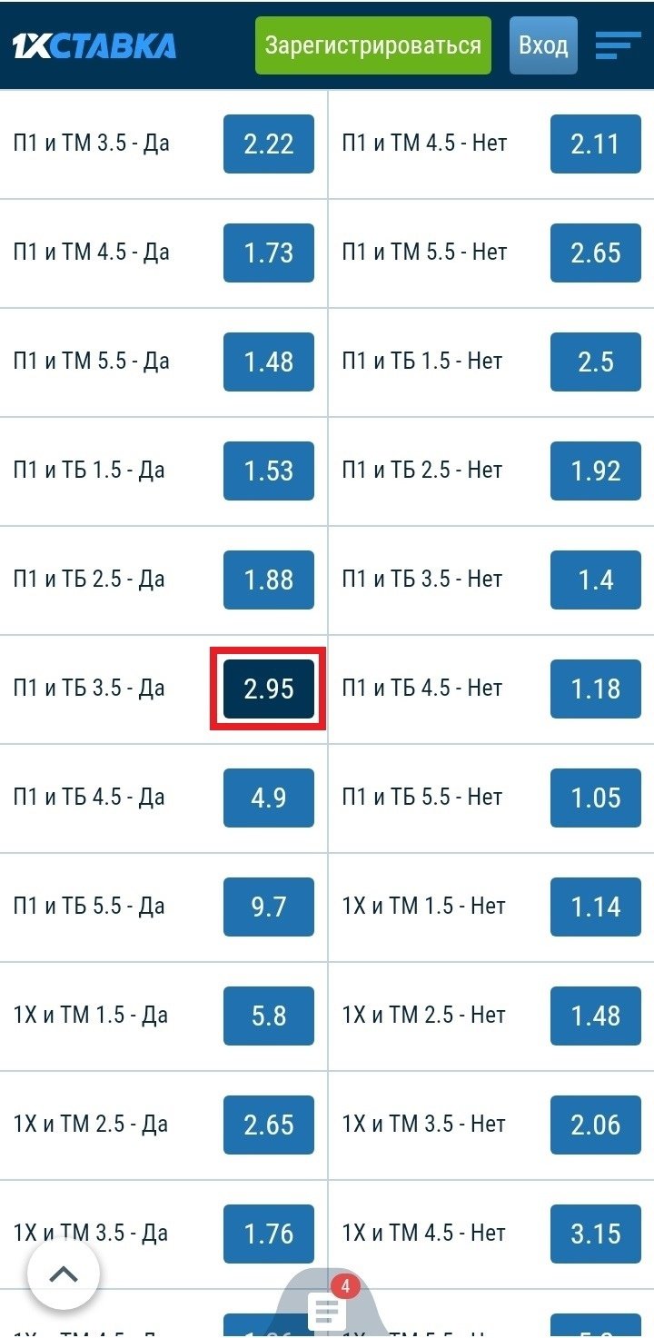 Предположим, играет «Рома» и «Лечче». Коэффициент на П1 — победу «Ромы» — очень маленький. Но мы вправе рассчитывать, что в таком матче будет забито много голов. Таким образом, мы можем поставить на комбинированный тотал — исход матча + стандартный тотал. Выбираем ставку П1 + ТБ 3,5 гола. Наша ставка сыграет в случае победы «Ромы», а количество забитых мячей должно быть не меньше четырёх. Например, если матч завершится со счётом 3:1.