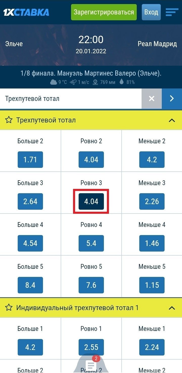 Трёхпутевой тотал три в матче «Эльче» — «Реал». Это означает, что он делится на три части: