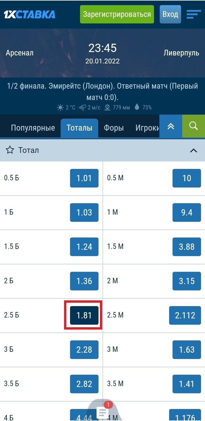 Ставки на тотал довольно популярны в лайве, так как вы можете полагаться на текущий ход матча и счёт. Исходя из того, что происходит в матче, вы выбираете подходящий тотал.