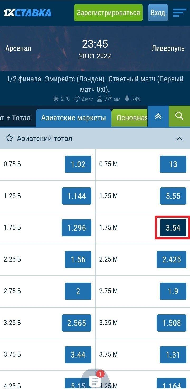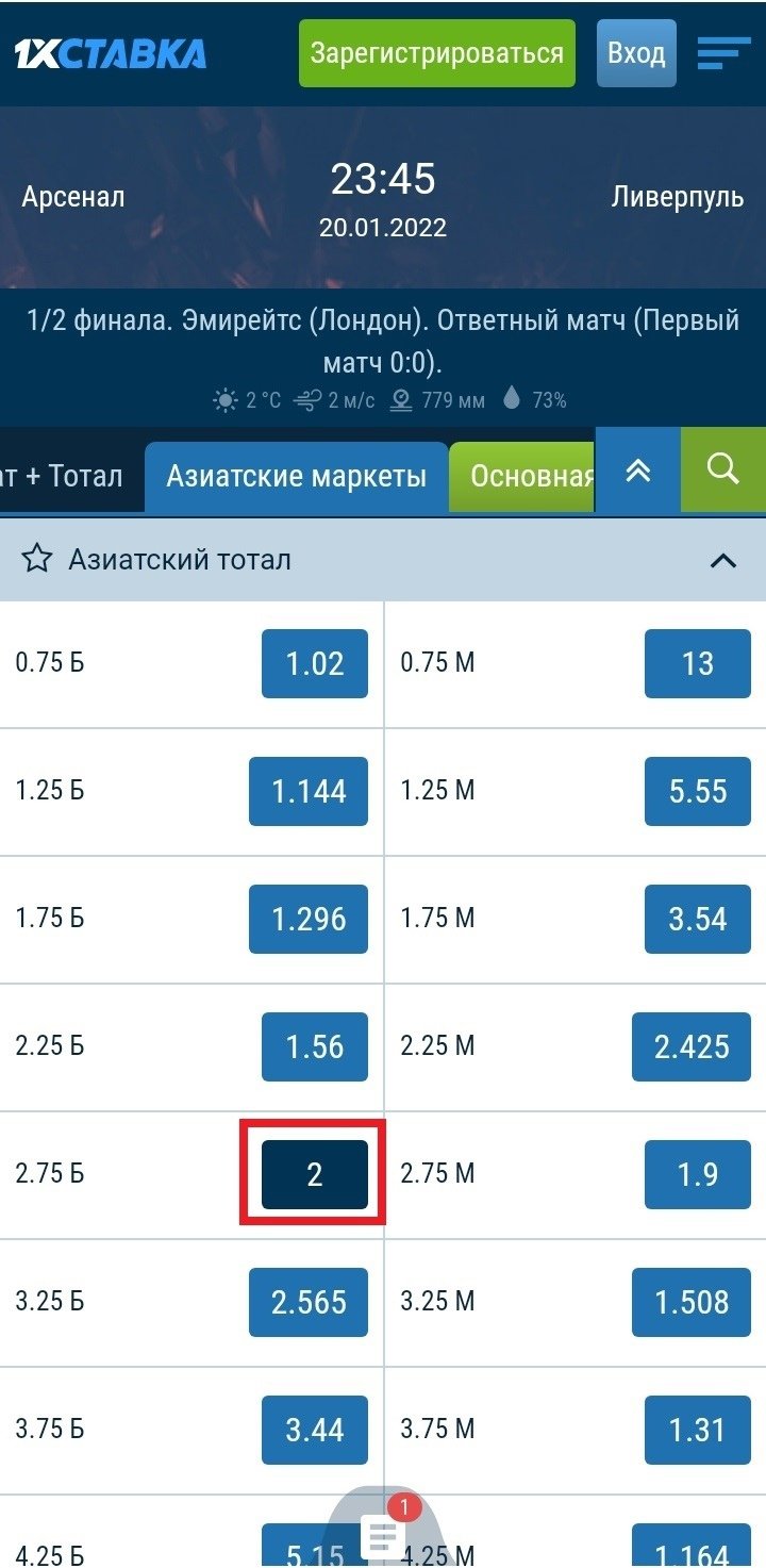 Нюансы расчёта проще понять, если видеть саму ставку на азиатский тотал: в линии она заканчивается на «.25» или на «.75». Дробная часть обозначает, на какие две ставки делится сумма пари при расчёте: для этого надо прибавить и вычесть четвертинку из обозначения тотала. Так, тотал больше 2,75 означает, что считать букмекер будет по ставке ТБ 2,5 и ТБ 3.