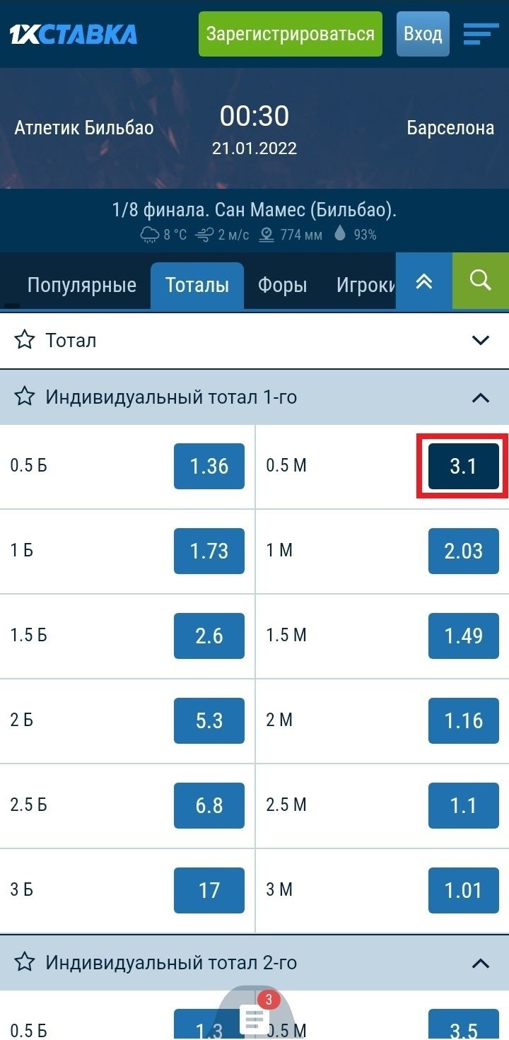 Обозначение ИТБ и ИТМ определяет большее или меньшее количество результативных действий, указанных в ставке. Например, мы решили поставить на индивидуальный тотал голов команд в матче.