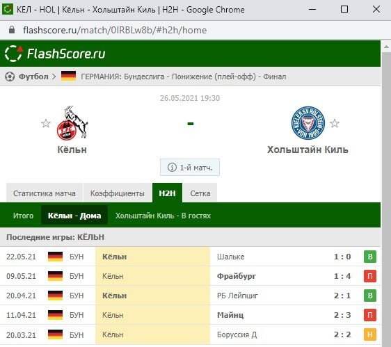 Открываем сервис Flashscore, находим наш матч и считаем, сколько в среднем забивает и пропускает «Кёльн» дома, а «Хольштайн Киль» — в гостях.