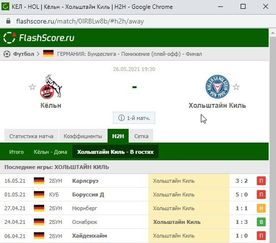 Пример. Рассмотрим конкретный матч: «Кёльн» — «Хольштайн Киль».
