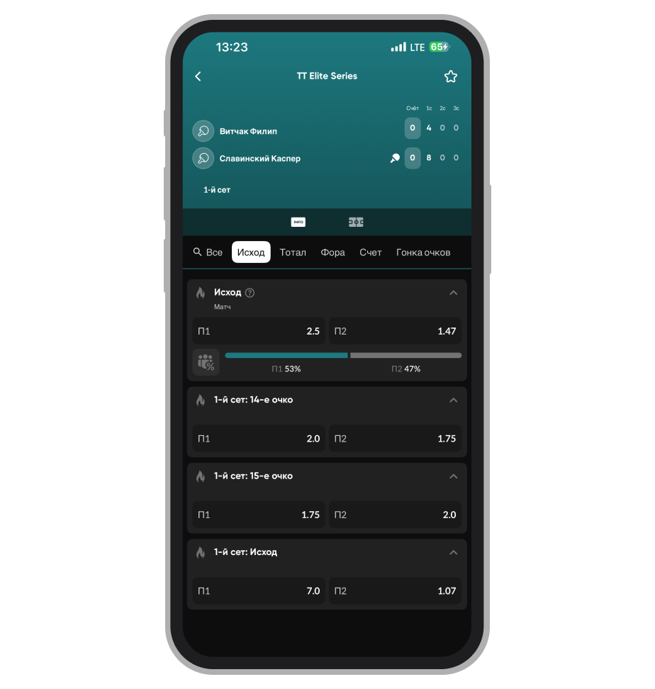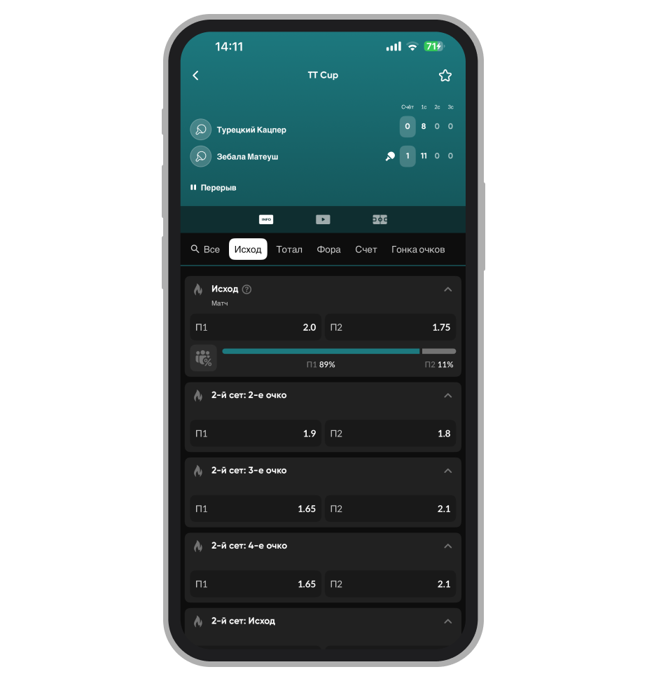 Настольный теннис — игра качелей: отрыв в три-четыре очка легко отыгрывается. Из-за этого линия букмекеров часто реагирует слишком резко на текущую разницу в счёте, что позволяет ловить выгодные плюсовые форы или индивидуальные тоталы.