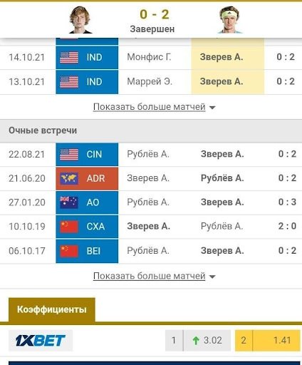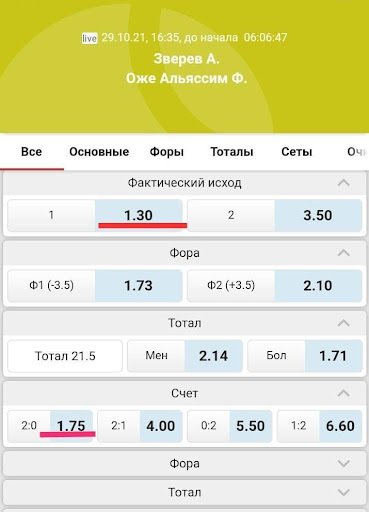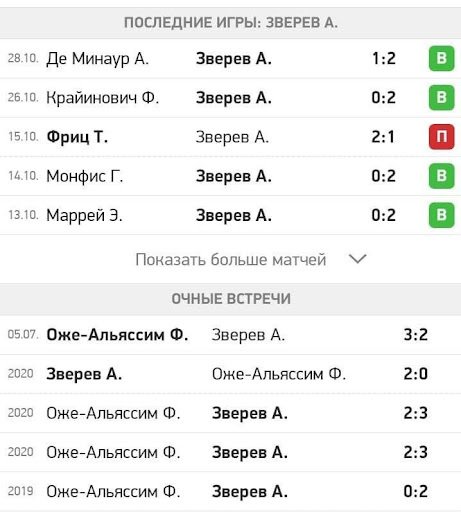 Пример подбора матча. Игра Зверева с Оже-Альяссим. У многих контор котировки на выигрыш немца не превышают 1.3, но статистика личных встреч не столь убедительная. Хотя бы один сет канадец выигрывал в недавних личных встречах, но уступил четыре раза из пяти. Да и сам Зверев в недавних встречах на этом же покрытии играл не идеально: уступил в одной встрече и ещё в одной отдал сет.