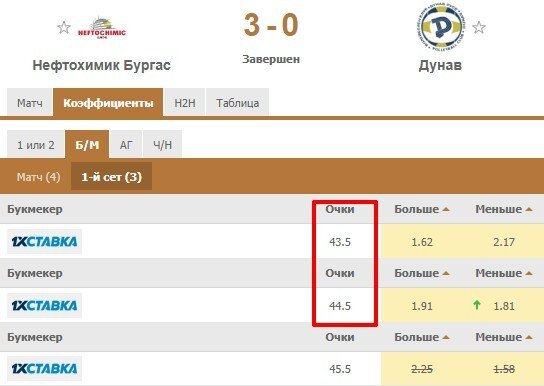 В мужском чемпионате Болгарии рассмотрим матч «Нефтохимика» и «Дунава» — абсолютного фаворита и аутсайдера. На победу «Дунава» дают больше 9, это подходящая разница в кэфах. Мы взглянули на предложения в линии букмекеров и видим, что здесь есть даже более «безопасные» тоталы — 43.5 и 44.5. Если бы вы взяли любой из них, то тотчас бы выиграли не только в этой партии, но и в двух последующих, так как там были счета 25:16.