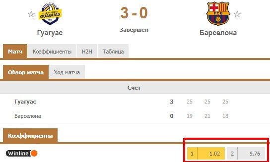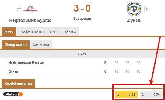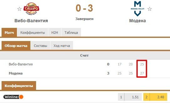 Матч мужского чемпионата Италии между «Вероной» и «Топ Воллей Латиной». Как видно, коэффициенты на успех команд схожи. Мы поставили 1000 рублей на ТБ 45.5 в первой партии с кэфом 1.52 и сразу выиграли 520 рублей чистыми.