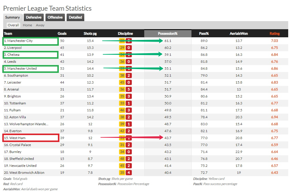 владеет мячом больше 55% игрового времени и наносит не меньше 14 ударов за игру в течение сезона. Можно брать и статистику за прошлый год, если командой руководит прежний тренер;