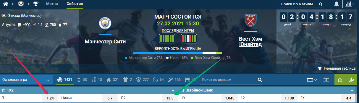 коэффициент на победу «Манчестер Сити» меньше 2.00 (1.23).